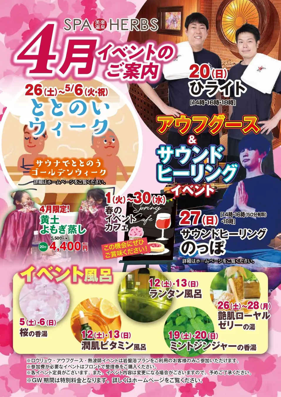 埼玉最大級のスパリゾート「美楽温泉 SPA-HERBS(スパハーブス)」が、春の訪れとともに、4月もイベント盛りだくさんでお出迎え!