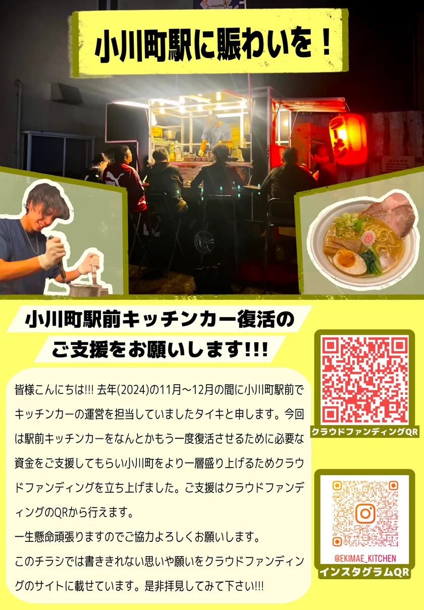 埼玉県比企郡小川町で、駅前を盛り上げるためのキッチンカープロジェクト「駅前キッチンカーから始まる小川町リメイク!!!」がスタートしました。運営資金の支援を募るクラウドファンディングが、2025年2月1日よりCAMPFIREにて開始されています。