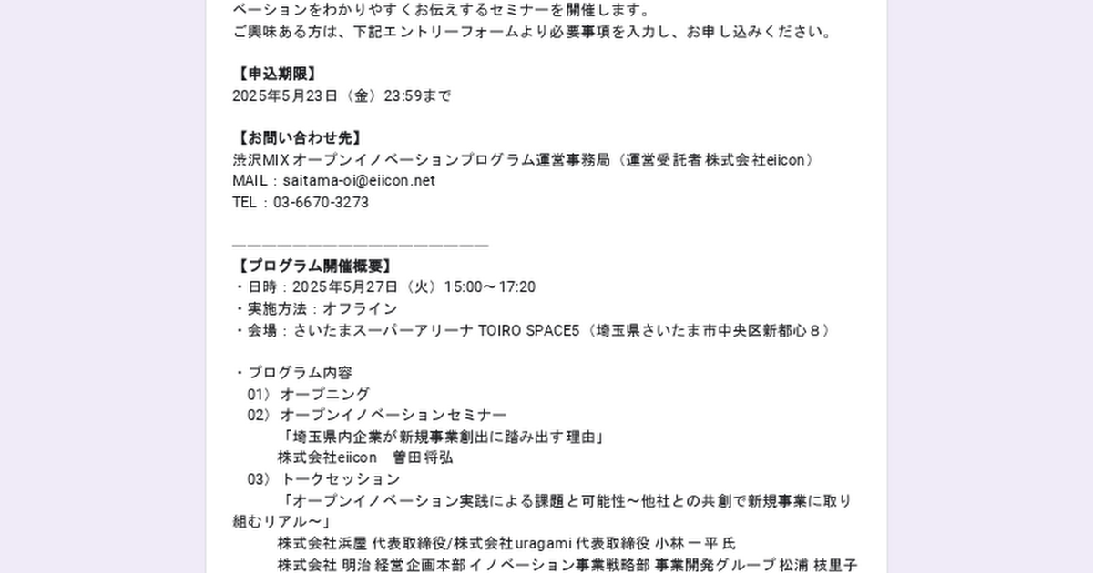 当日は「埼玉県内企業が新規事業に踏み出す理由」をテーマに、株式会社eiicon 曽田将弘氏によるセミナーや、オープンイノベーションの実践現場を知るトークセッションも予定。現役経営者やイノベーション事業開発担当者のリアルな声が聞けるチャンスです。もちろん、プログラムの詳細説明や質疑応答タイム、ネットワーキング(交流会)も用意されています。