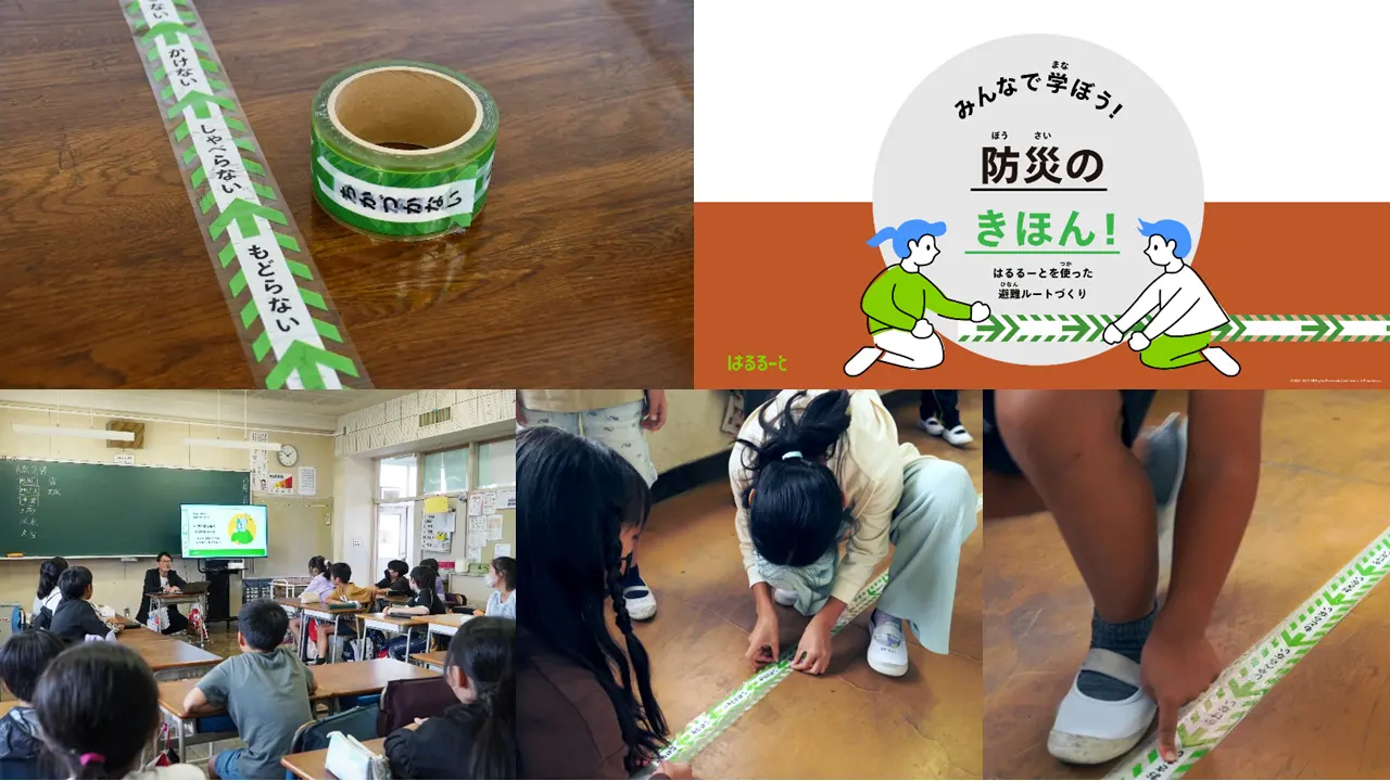 「はるるーと」は、幅約5センチメートルのビニールテープに、避難時の合言葉「おかしもち」(おさない・かけない・しゃべらない・もどらない・ちかよらない)と矢印がプリントされた、シンプルながらも実用性の高いアイテム。このデザインがまたかわいらしくて、子どもたちにも親しみやすい工夫がされています。