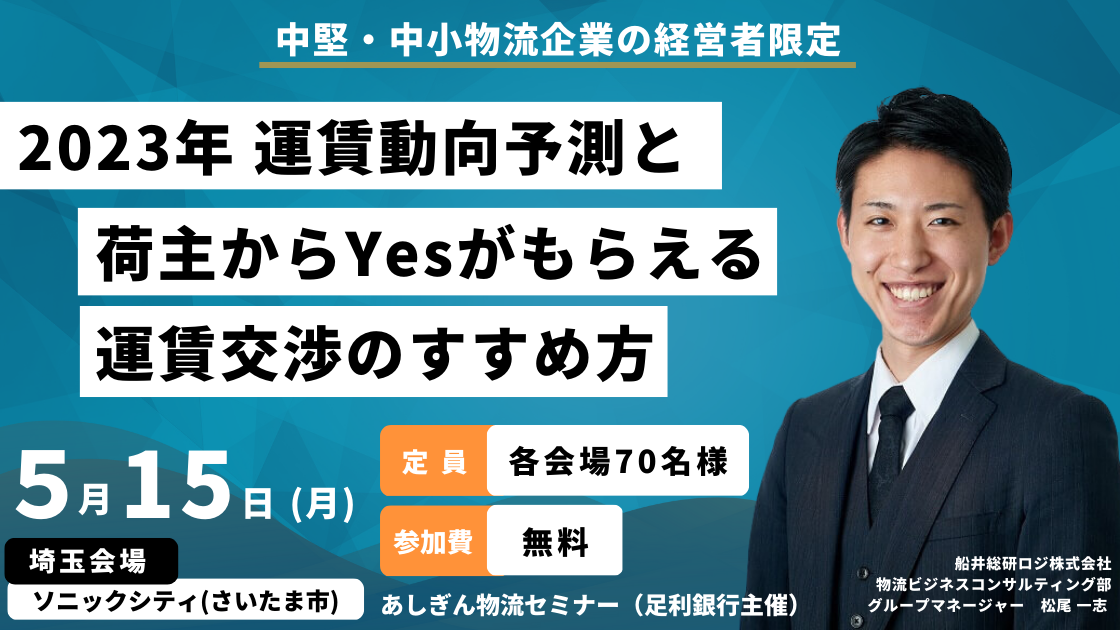 2023年5月15日(月)株式会社足利銀行様が主催する『あしぎん物流セミナー』にて、2023年 運賃動向予測と荷主からYesがもらえる運賃交渉のすすめ方についてお伝えします。